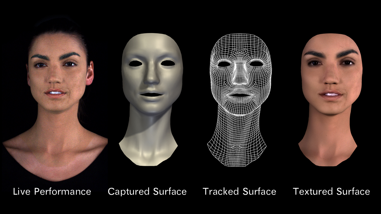 Four stages of Movas Contour Reality Capture system, resulting in a high resolution, photoreal animated character.